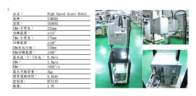 品牌: 雅馬哈 YAMAHA 產地:日本出廠日期:2007年本體型號: YK-400X控制器型號:RCX142 示教器:有類型:水平四軸負載:3kg臂長:400mm本體重量:15kg樣式:壁掛式運行狀況:運行正常精度:0.02mm配套軟件:有說明書:有